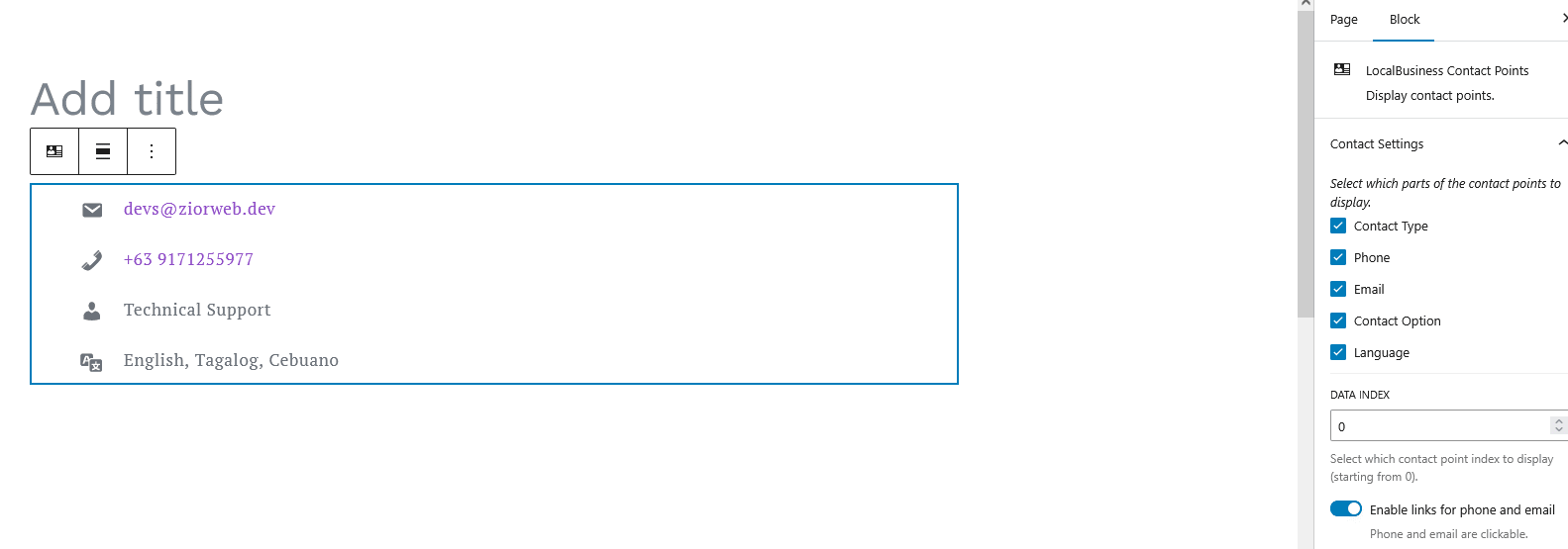 Contact Points Block: Displays structured contact details such as phone numbers and contact types.