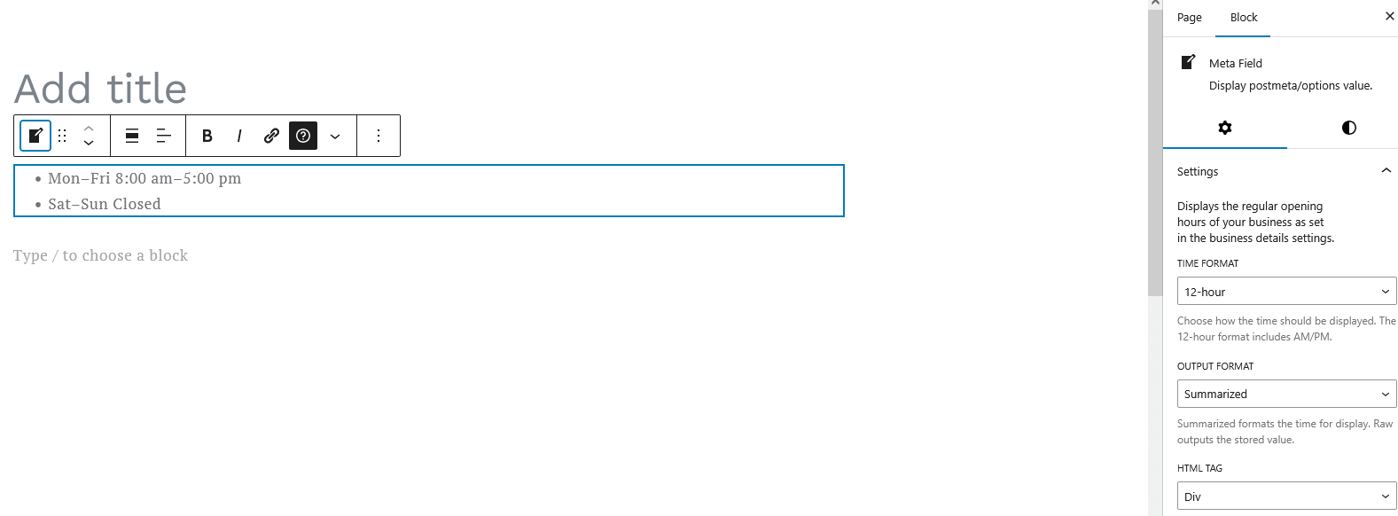 Meta Field Block: Display dynamic business data such as name, phone number, URL, and other schema fields.